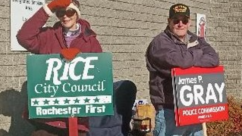 | Susan Rice, who won a City Council seat, left, and Jim Gray, who won a spot on the police commission, welcome voters to the polls at the James W. Foley Memorial Community Center on Tuesday. (Rochester Voice photo) |