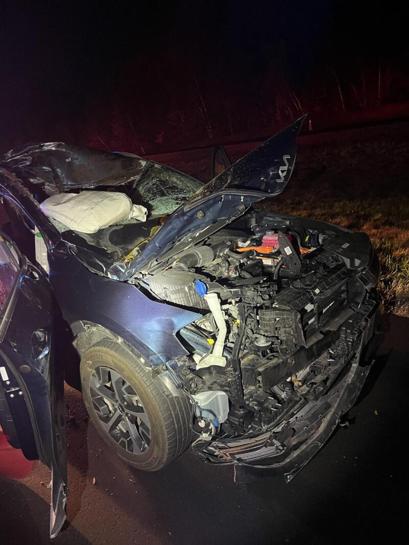 When Troopers arrived, they determined that the driver of a Mazda 3 was traveling eastbound when the car struck a moose, according to a Dept. of Safety press release sent out today. The moose then crossed the median and entered the westbound lanes, where it was struck by a Kia Sportage.